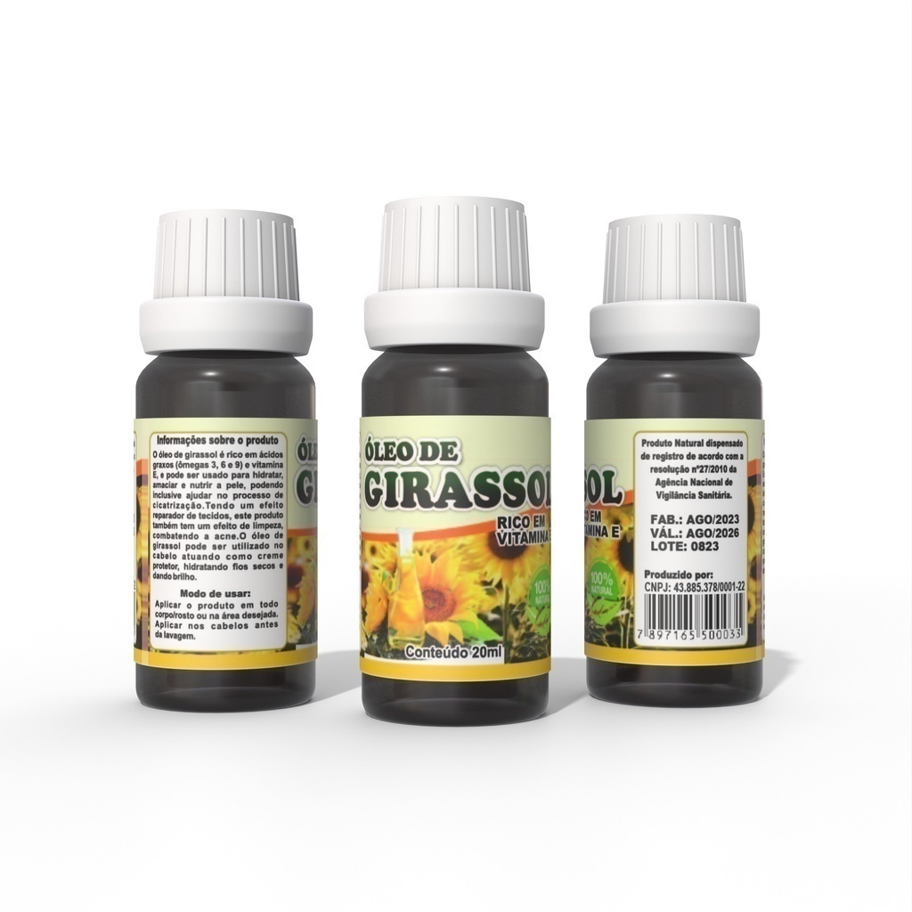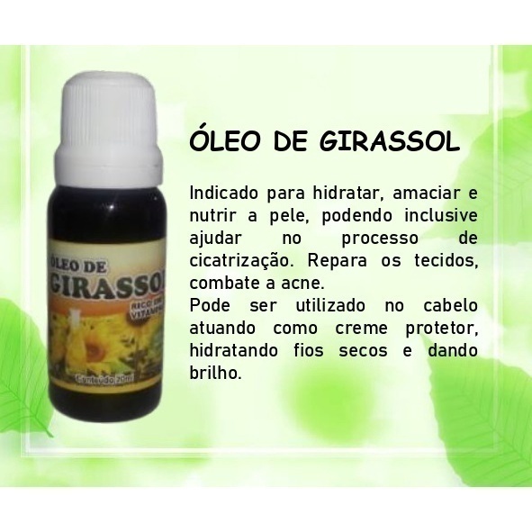 O Óleo de Girassol é indicado para hidratar, amaciar e nutrir a pele, podendo inclusive ajudar no processo de cicatrização. Repara os tecidos, combate a acne. Pode ser utilizado no cabelo atuando como creme protetor, hidratando fios secos e dando brilho. Apresentação: em frasco de 20ml com gotejador (conta gota) e tampa lacre. ? ATENÇÃO: Este não é um óleo essencial, não sendo recomendado portanto para fins aromáticos. O método de extração a frio não é focado em extrair o cheiro do material, portanto a maioria dos óleos vegetais não possuem cheiro característico. Sua principal função é extrair as propriedades da matéria prima para ingerir/utilizar na pele. Alguns tipos de óleos necessitam de outros óleos carreadores (como amêndoas, argan e oliva) para a diluição correta e estes são em geral neutros 100% vegetais também. Assim sendo, não se recomenda o uso do óleo vegetal para aromaterapia ou para essências, pois este não é seu propósito. ----------------------- IMPORTANTE! Pode ocorrer VARIAÇÃO de tonalidade entre a imagem de exibição e o produto físico. Em caso de dúvidas, mande a sua pergunta, ficaremos felizes em falar com você :)