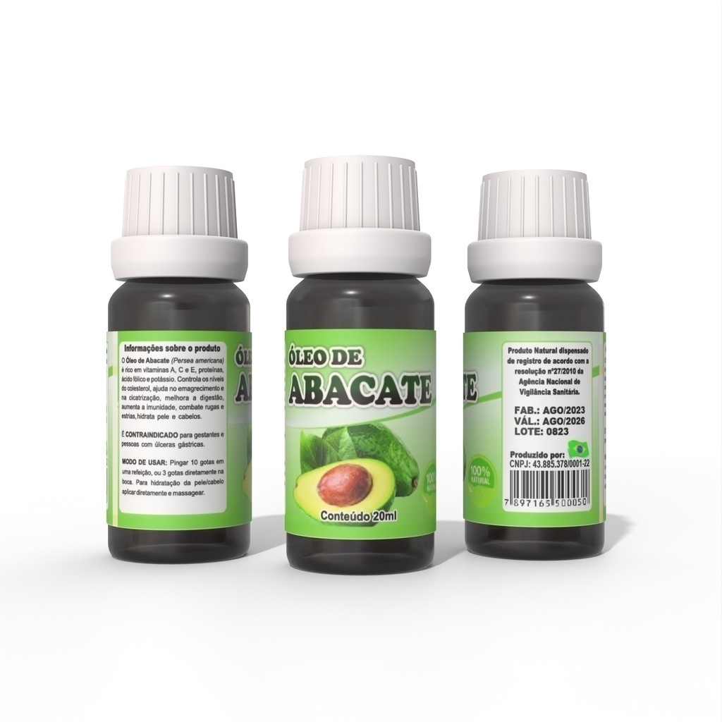 O Óleo de Abacate controla os níveis de colesterol, ajuda no emagrecimento e na cicatrização, melhora a digestão, aumenta a imunidade, combate rugas e estrias, hidrata pele e cabelo. Apresentação: em frasco de 20ml com gotejador (conta gota) e tampa lacre. ? ATENÇÃO: Este não é um óleo essencial, não sendo recomendado portanto para fins aromáticos. O método de extração a frio não é focado em extrair o cheiro do material, portanto a maioria dos óleos vegetais não possuem cheiro característico. Sua principal função é extrair as propriedades da matéria prima para ingerir/utilizar na pele. Alguns tipos de óleos necessitam de outros óleos carreadores (como amêndoas, argan e oliva) para a diluição correta e estes são em geral neutros 100% vegetais também. Assim sendo, não se recomenda o uso do óleo vegetal para aromaterapia ou para essências, pois este não é seu propósito. ----------------------- IMPORTANTE! Pode ocorrer VARIAÇÃO de tonalidade entre a imagem de exibição e o produto físico. Em caso de dúvidas, mande a sua pergunta, ficaremos felizes em falar com você ;)