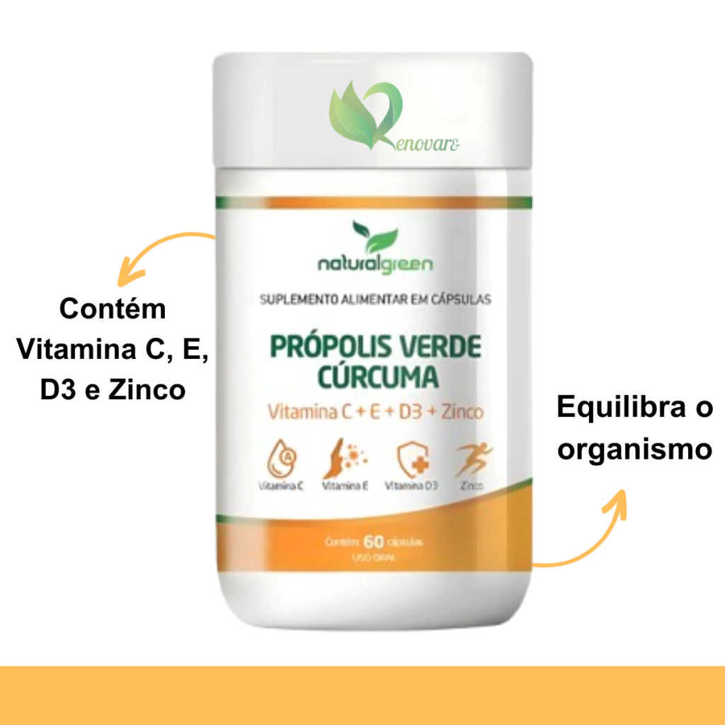 O Suplemento Alimentar de Própolis Verde com Cúrcuma é formulado com ingredientes cuidadosamente selecionados, combinando compostos naturais e vitaminas essenciais que auxiliam na manutenção da imunidade, proteção celular e equilíbrio do organismo.