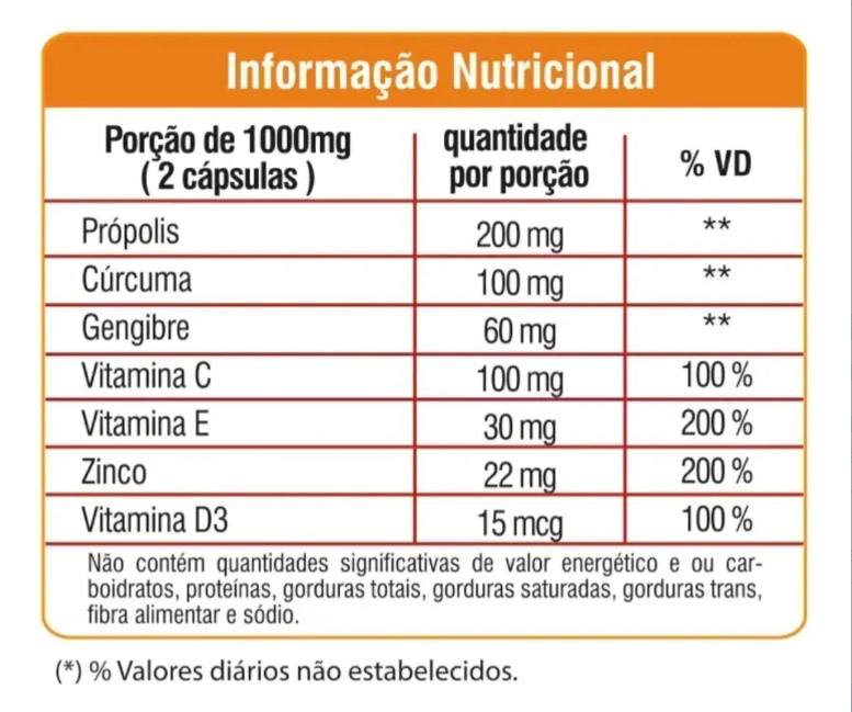Extrato de própolis, extrato de rizoma de cúrcuma longa, amido de milho, ácido ascórbico (vitamina C), DL-alfa-tocoferol (vitamina E), bisglicinato de zinco (zinco), colecalciferol (vitamina D3).